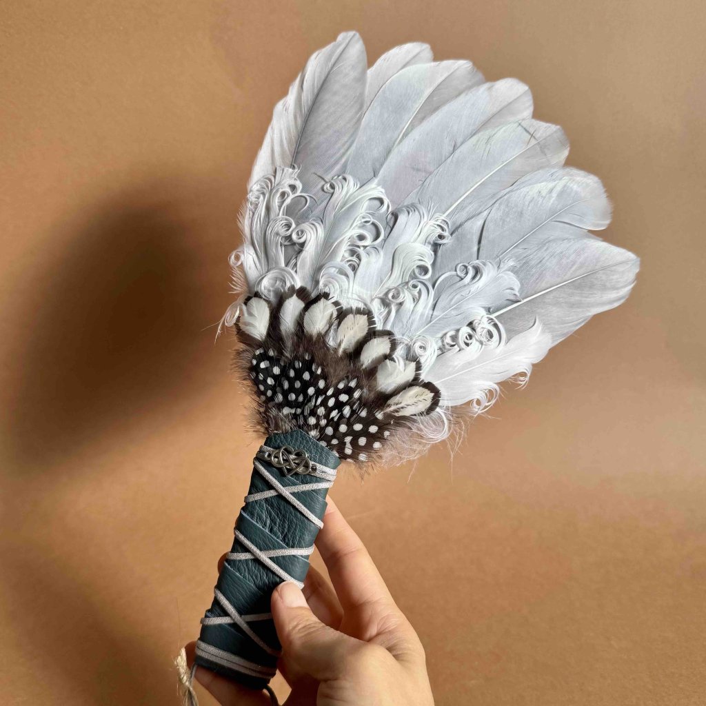Handcrafted feather fans are designed to disperse aromatic smoke during smudging and to support magical rituals. These fans enhance intentions and energetically cleanse the biofield of living beings, objects, and larger spaces. In ancient Native American philosophy, birds are messengers of prophecy and intermediaries between Heaven and Earth, which is the essence that the bird feathers bring us.