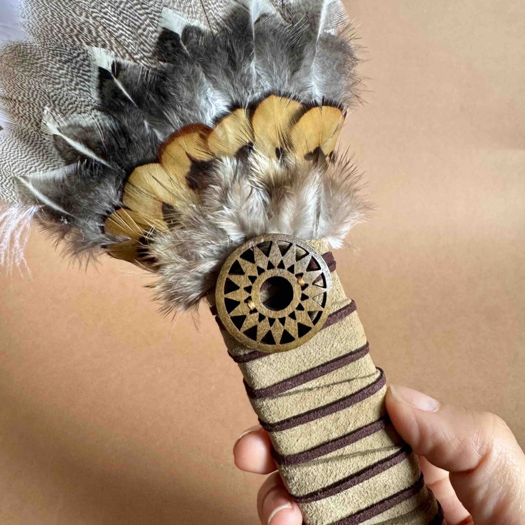 Ručně vytvořené peříčkové vějíře pro rozhánění vonného dýmu při vykuřování a k podpoře magických rituálů. Vějíře slouží k umocnění záměrů a k energetickému čistění biopole živých těl, předmětů i větších prostorových celků. V pradávné filozofii indiánů jsou ptáci poslové proroctví a prostředníci mezi Nebem a Zemí. Právě tuto esenci nám ptačí perutě přináší.