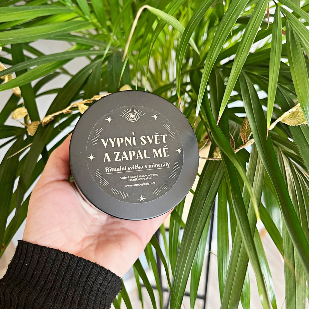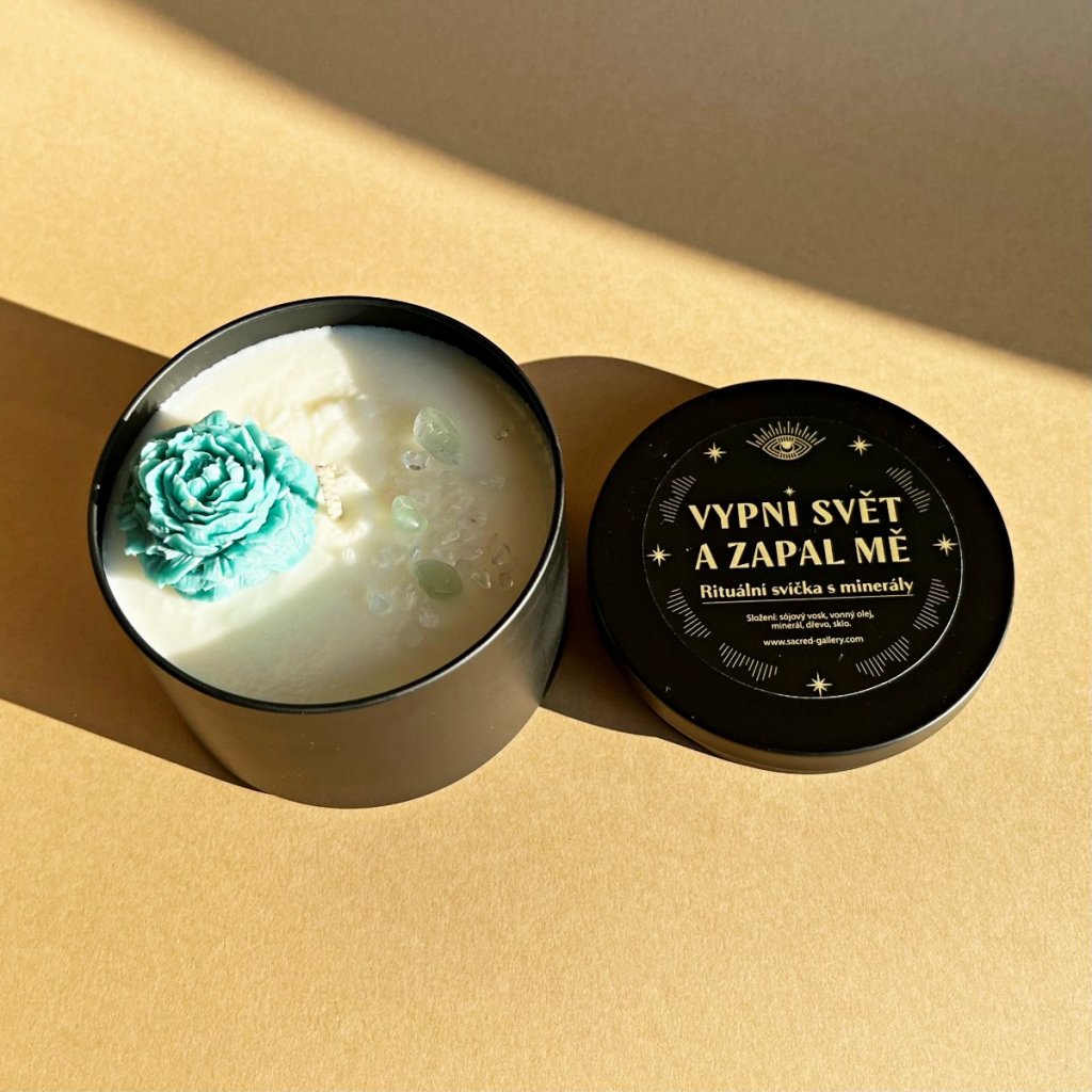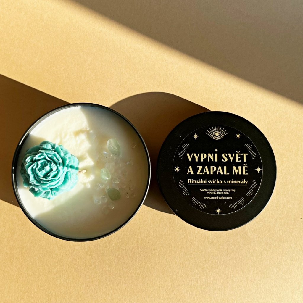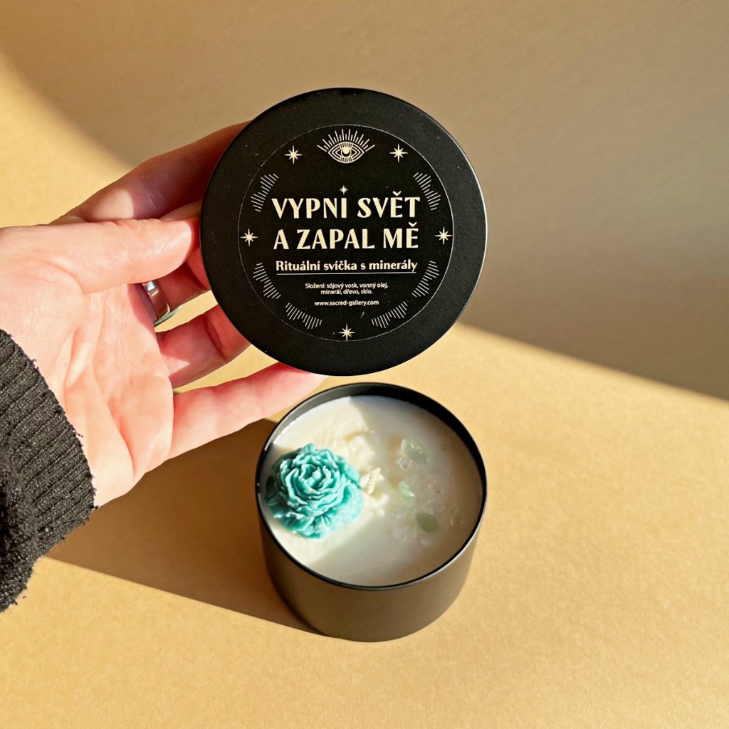 Vonná svíčka s kytičkou a minerály Vypni svět a zapal mě Sojová vonná svíčka